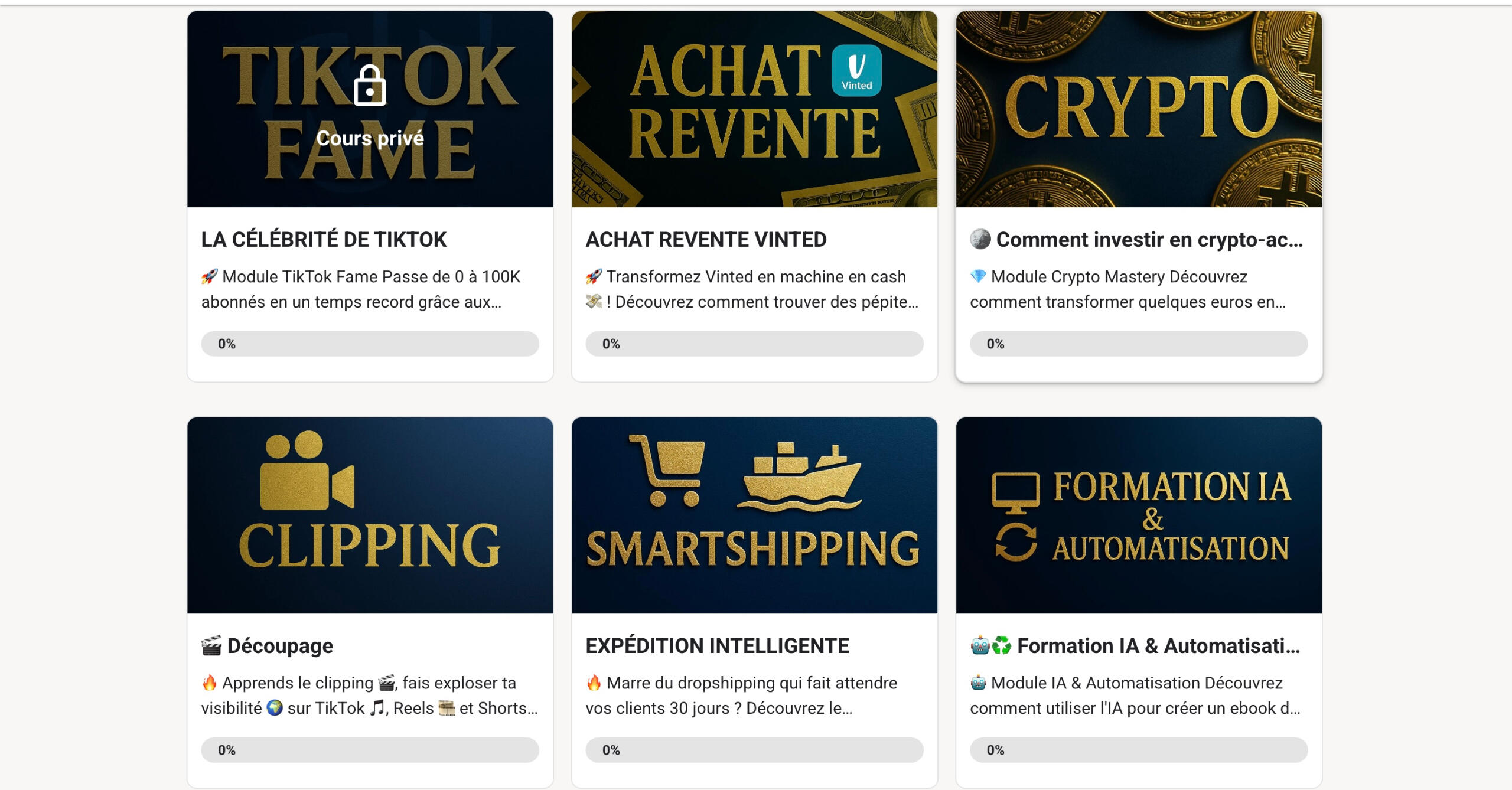 Avantages principaux (avec courts bénéfices) : Communauté privée et engagée — Accélérez vos décisions grâce aux retours concrets d’entrepreneurs qui testent en direct. Lives & coachings collectifs — Du feedback personnalisé, des corrections de stratégie et des sessions Q&A pour débloquer vos actions.